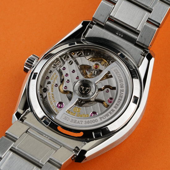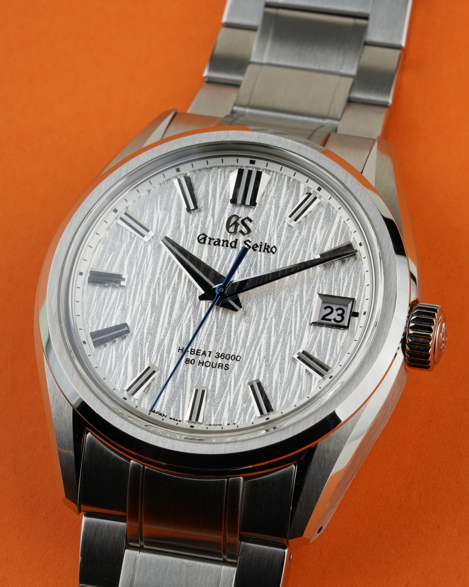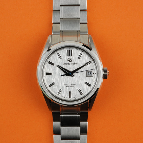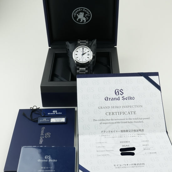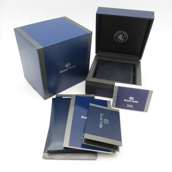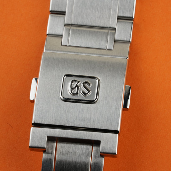 This model is distinguished by its 40 mm stainless steel case featuring a lower center of gravity for comfort, framing the dynamic textured white dial that captures the essence of the white birch forests near the Shizukuishi studio, presented on a stainless steel bracelet fitting a wrist up to approx. 19.5 cm. GS warranty card 2023-10-13