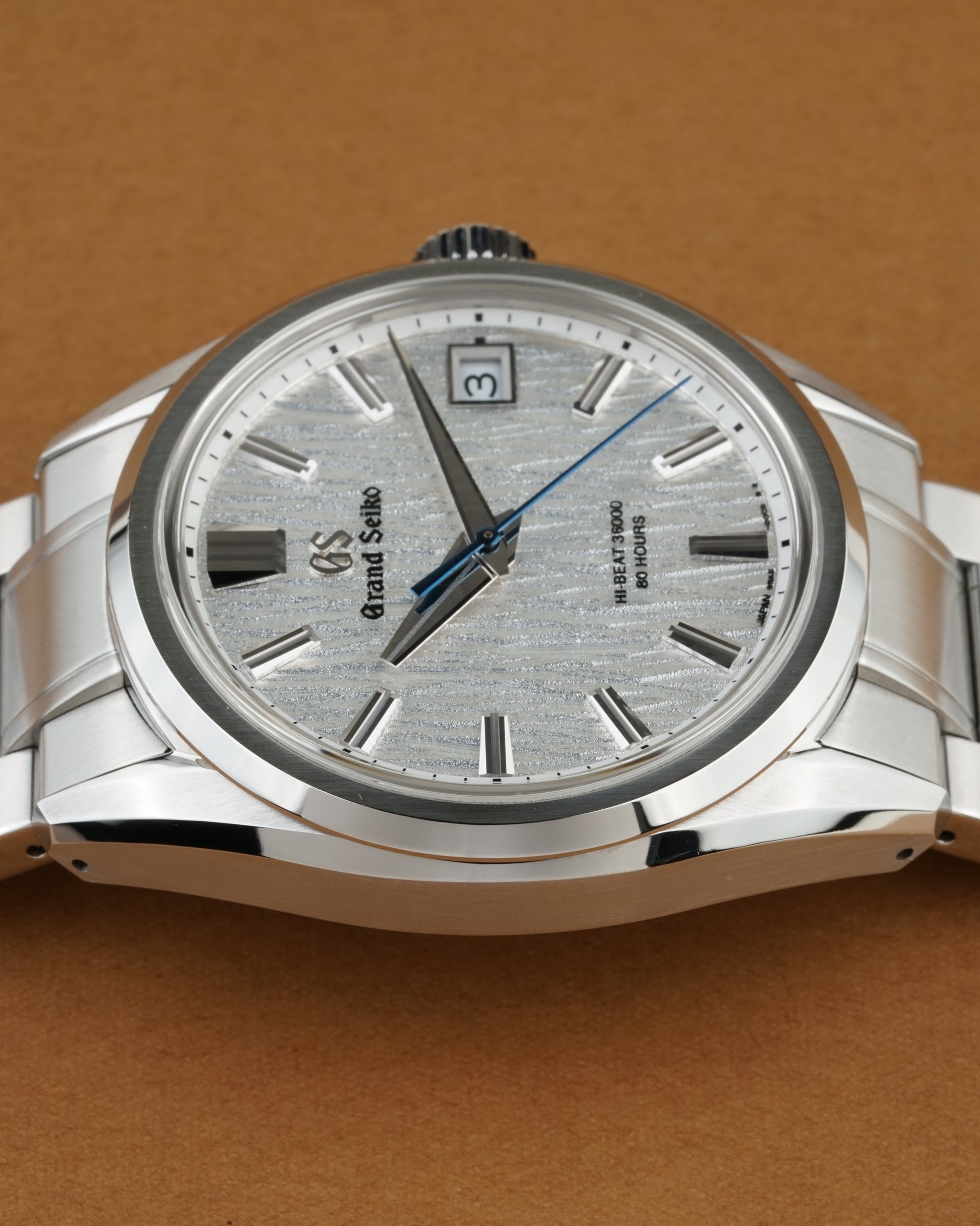 This model is distinguished by its 40 mm stainless steel case featuring a lower center of gravity for comfort, framing the dynamic textured white dial that captures the essence of the white birch forests near the Shizukuishi studio, presented on a stainless steel bracelet fitting a wrist up to approx. 19.5 cm.