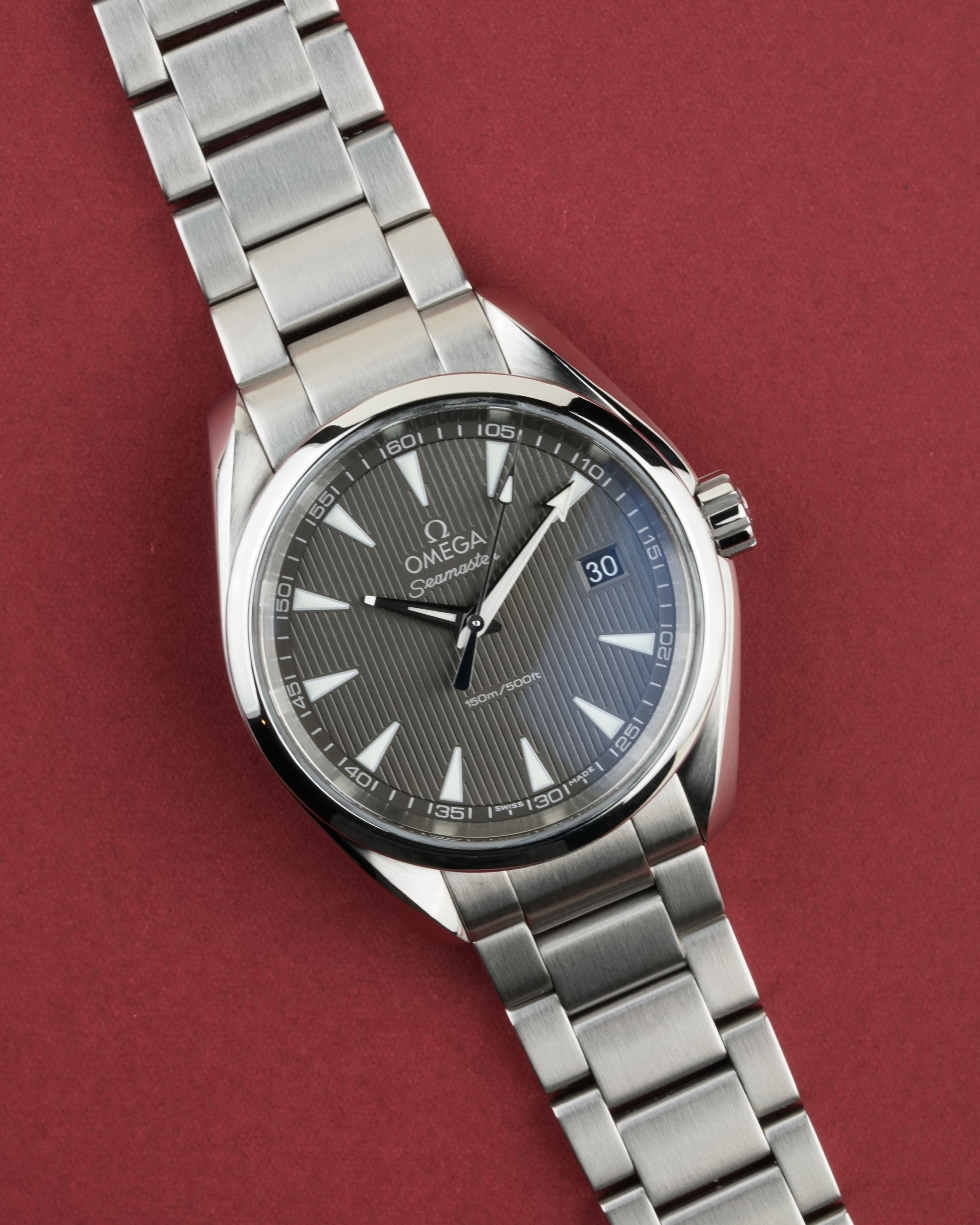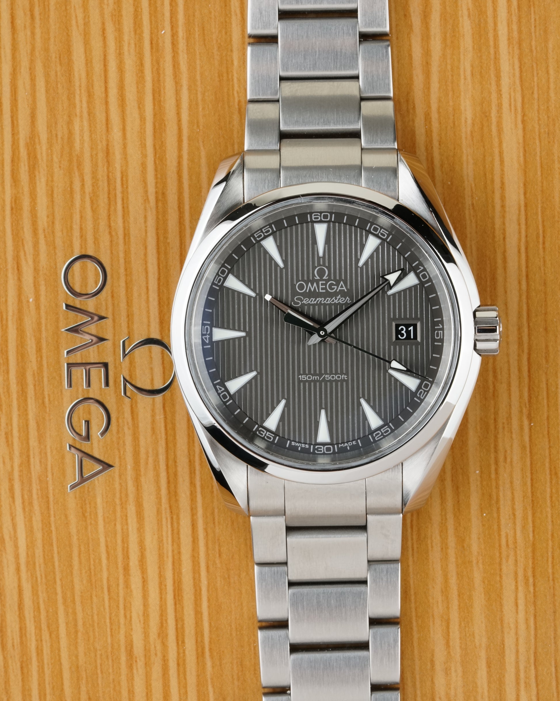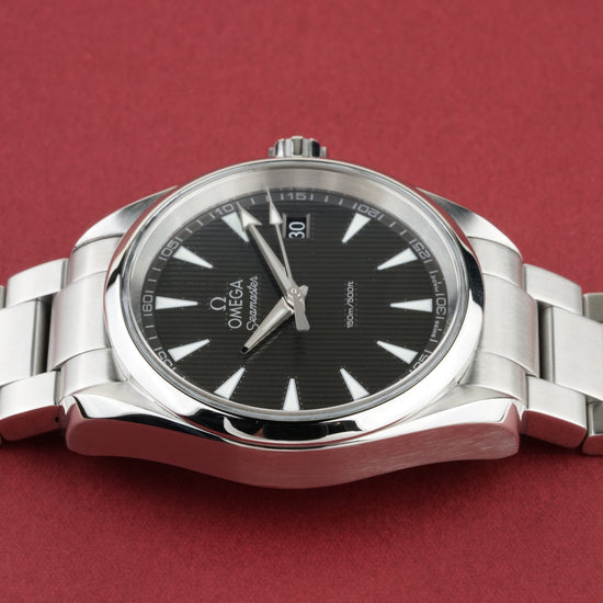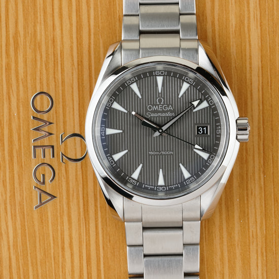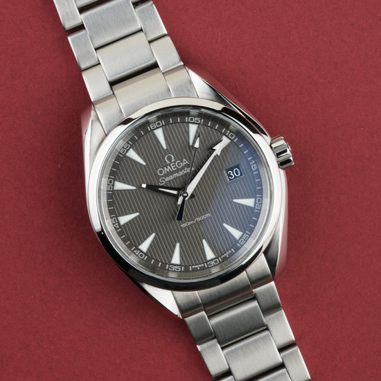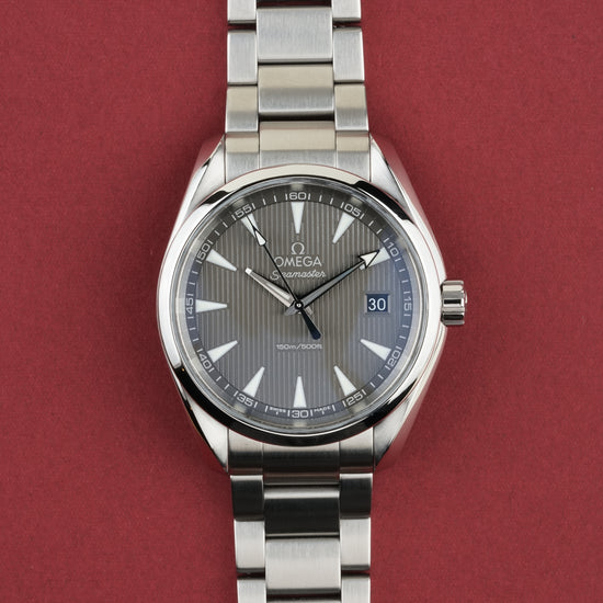 The Omega Seamaster Aqua Terra 150M Ref. 231.10.39.60.06.001 is a refined expression of maritime heritage and modern precision. Its 38.5 mm stainless steel case showcases a sophisticated gray dial with the signature "Teak Concept" vertical pattern, comfortably fitting a wrist up to 19 cm. Powered by the reliable Omega Caliber 4564 quartz precision movement, this timepiece offers grab-and-go convenience with the robust build quality of a true Seamaster. (Papers dated 10/2021).