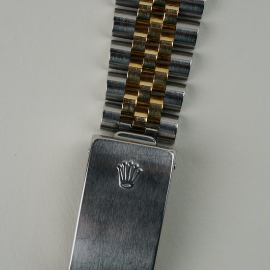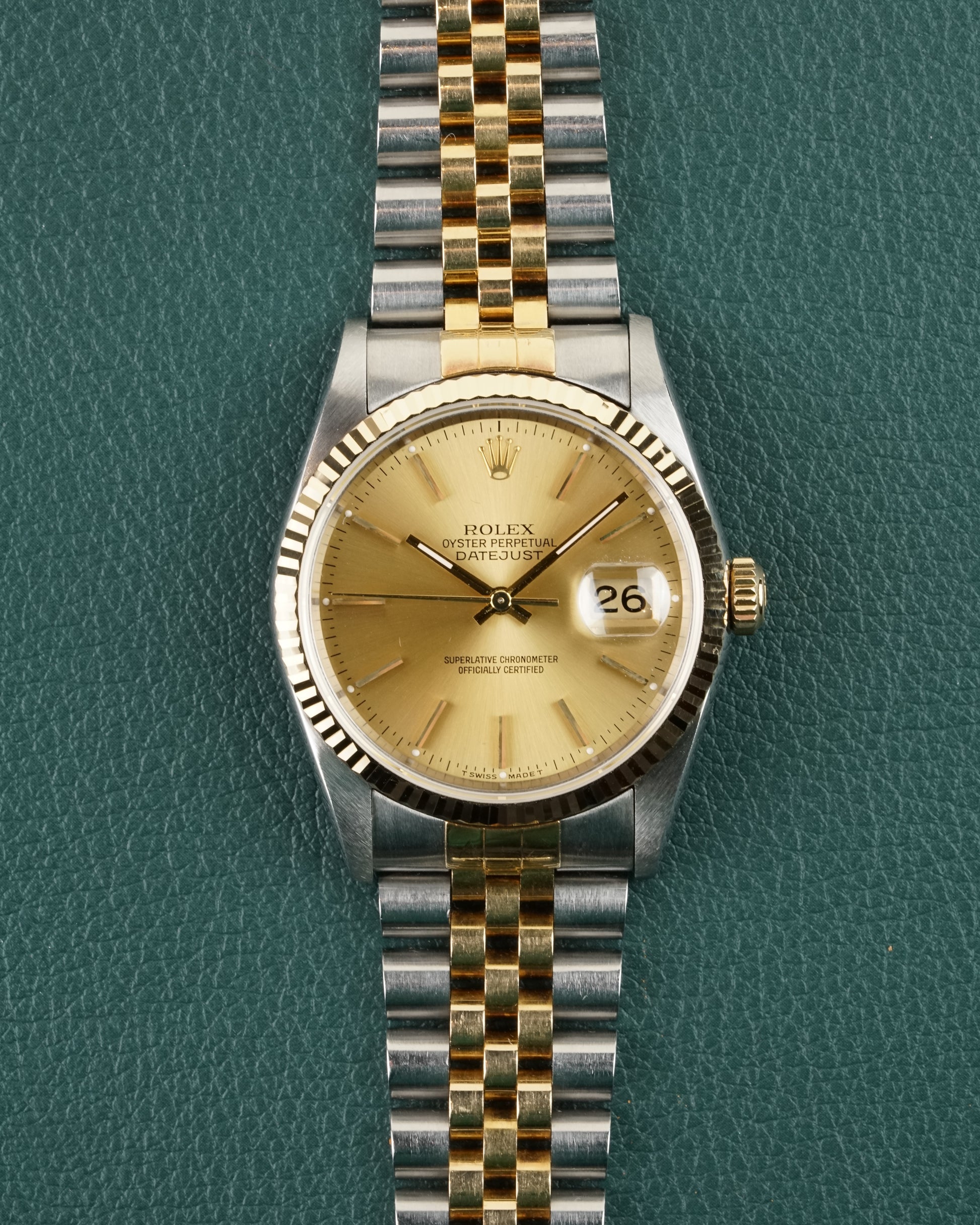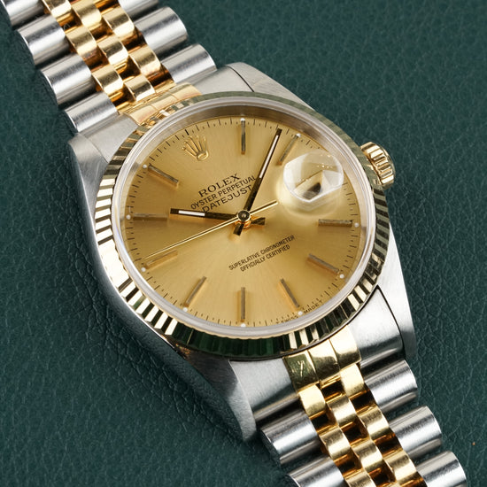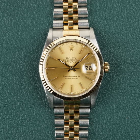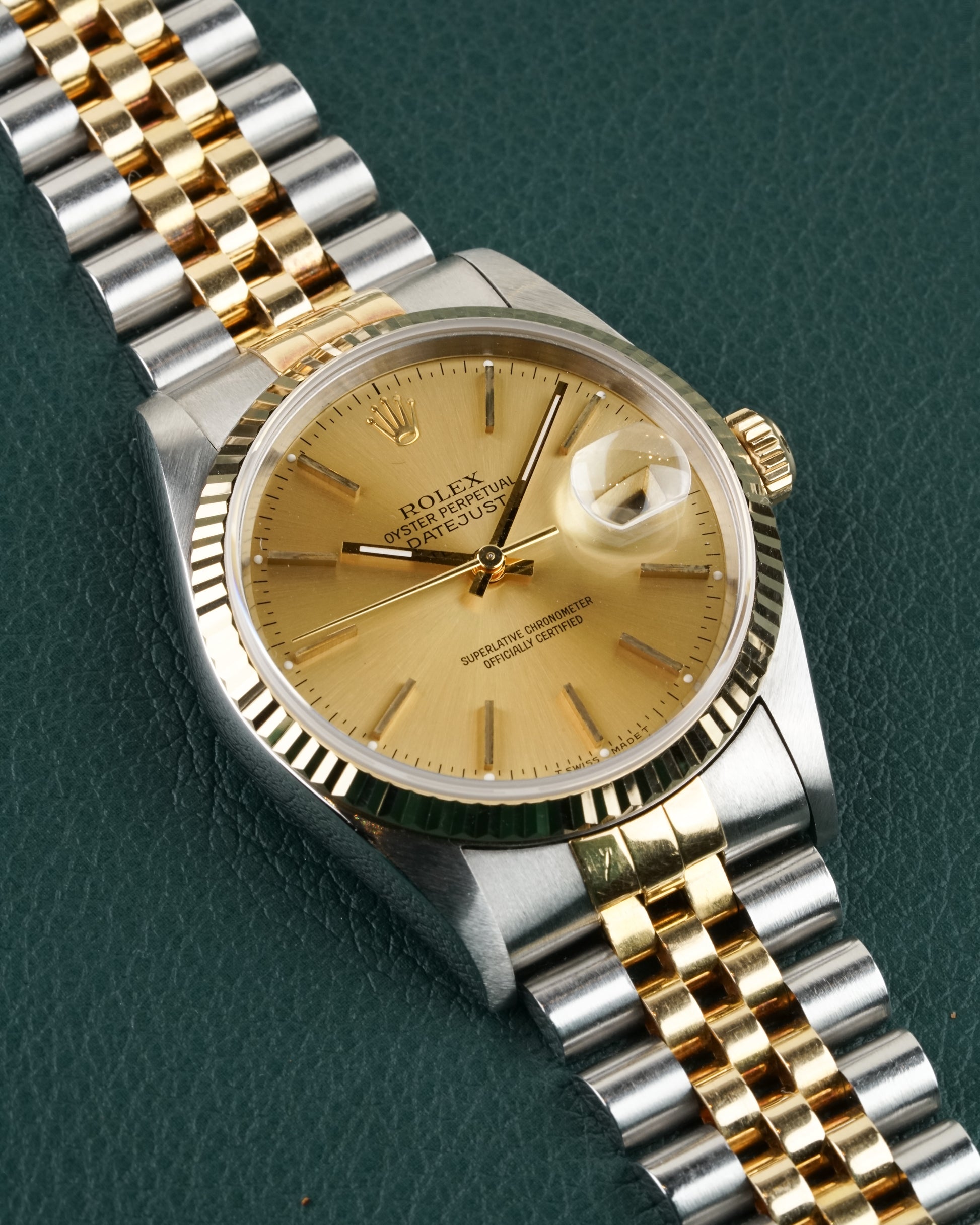 The Rolex Datejust Ref. 16233 is a standout example of neo-vintage character, distinguished by its champagne dial. Its classic 36 mm stainless steel and 18k yellow gold case is crowned by the iconic fluted bezel, creating a sophisticated play of light. Powered by the legendary automatic Caliber 3135, this timepiece combines the warmth of a two-tone icon with the robust reliability of Rolex's most celebrated workhorse movement. Serial year 2000 including box and papers.