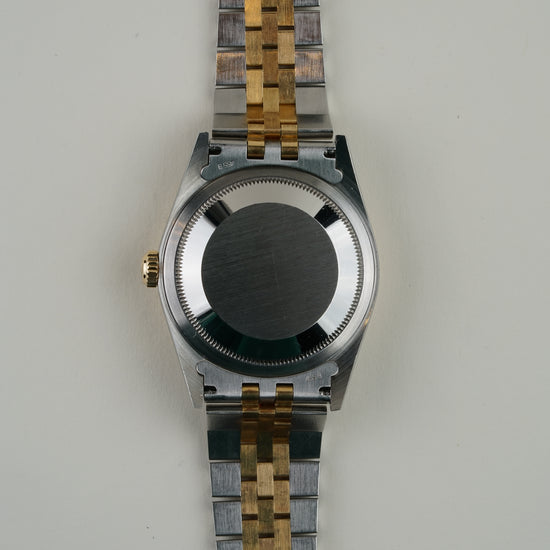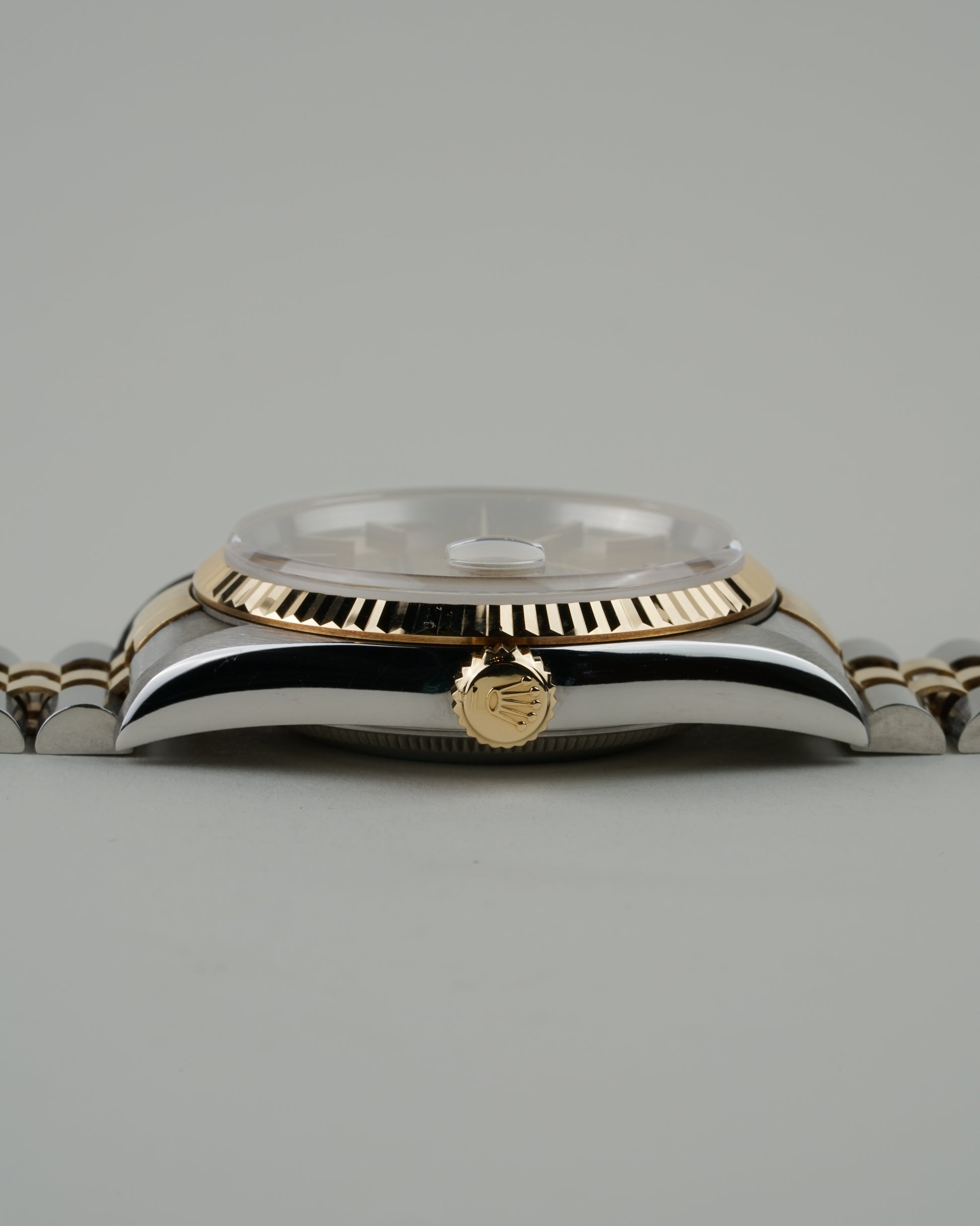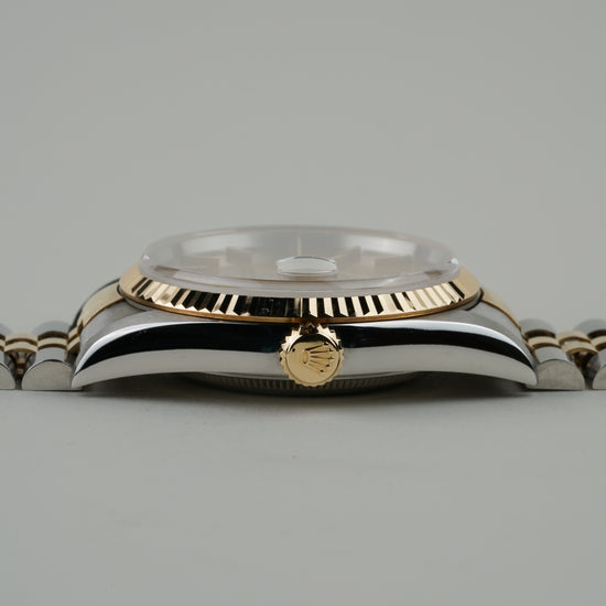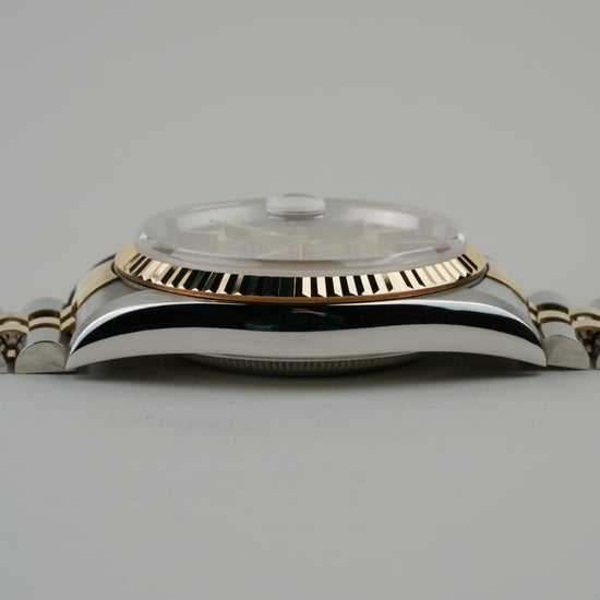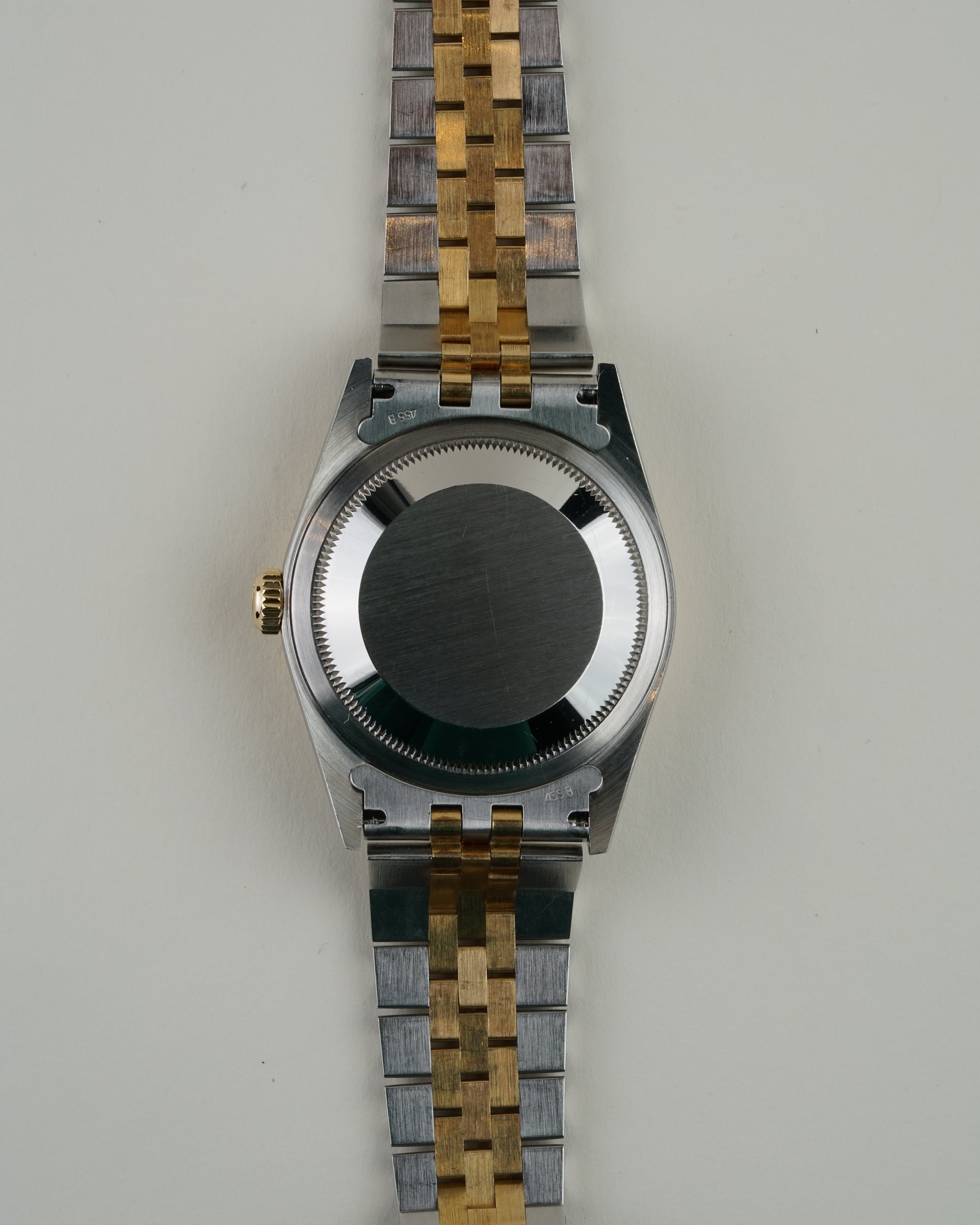 The Rolex Datejust Ref. 16233 is a standout example of neo-vintage character, distinguished by its champagne dial. Its classic 36 mm stainless steel and 18k yellow gold case is crowned by the iconic fluted bezel, creating a sophisticated play of light. Powered by the legendary automatic Caliber 3135, this timepiece combines the warmth of a two-tone icon with the robust reliability of Rolex's most celebrated workhorse movement. Serial year 2000 including box and papers.