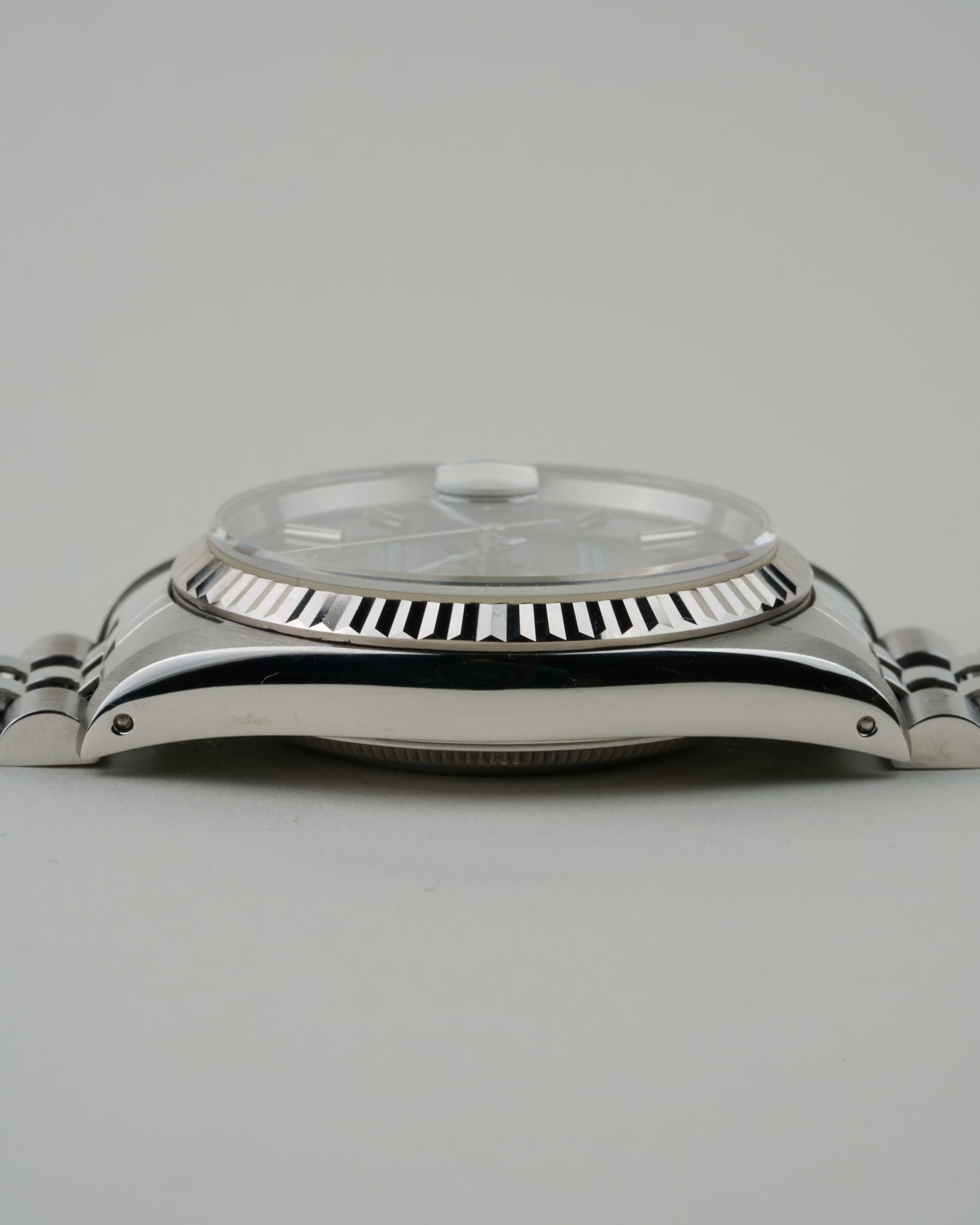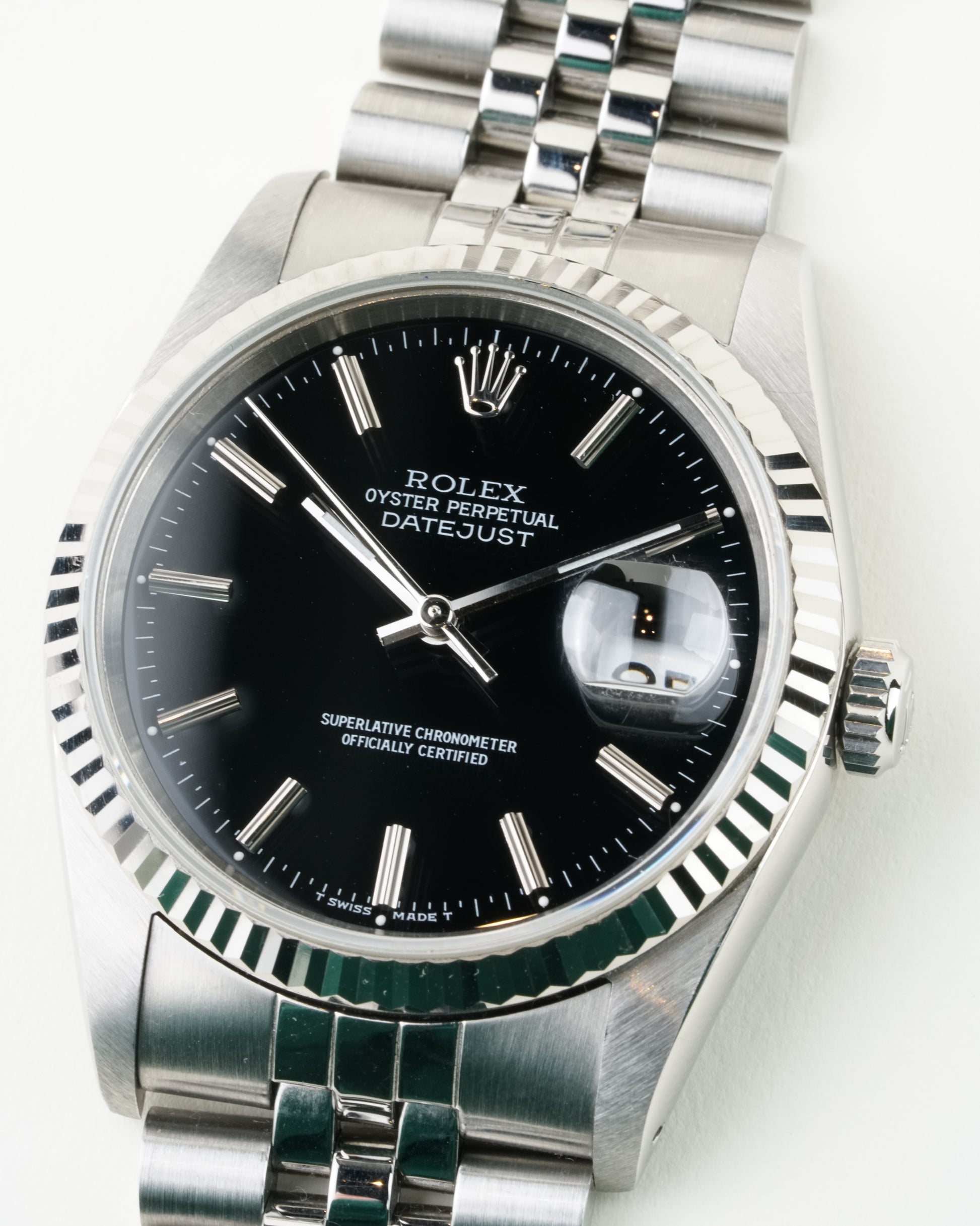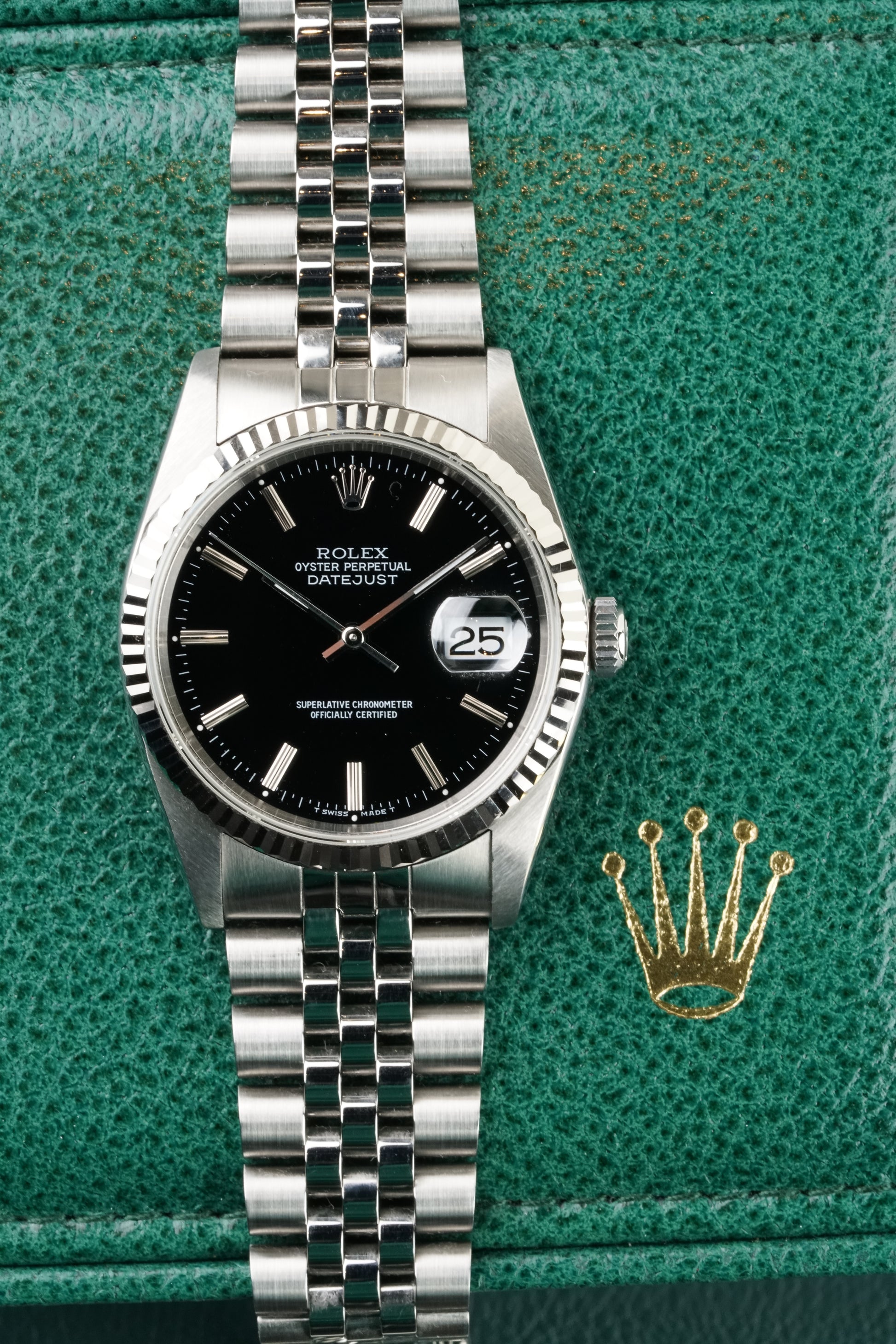 The Rolex Datejust Ref. 16234 is a definitive example of neo-vintage luxury. Its classic 36 mm stainless steel case is crowned by a signature 18k white gold fluted bezel, framing a black dial with stick indices that adds a refined depth to the design. Powered by the legendary automatic Caliber 3135, this 1998 Rolex Datejust Included with box and paper, perfectly balances robust reliability with timeless sophistication.