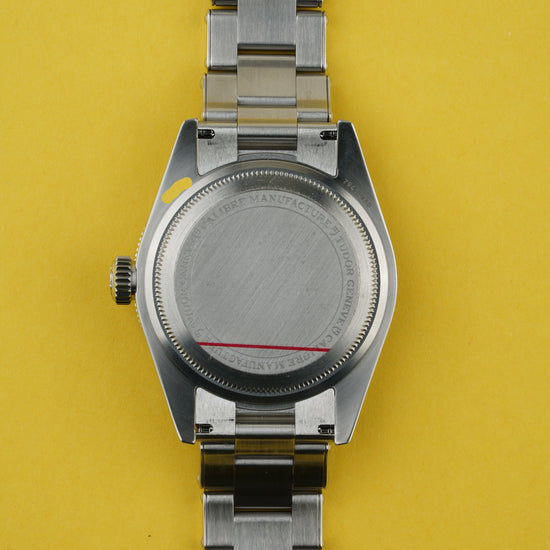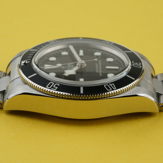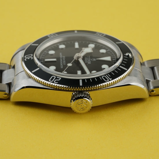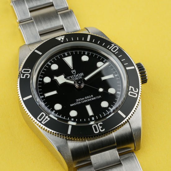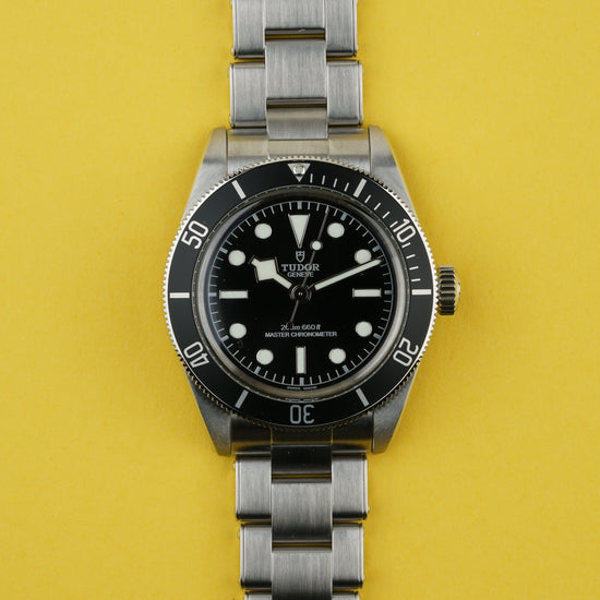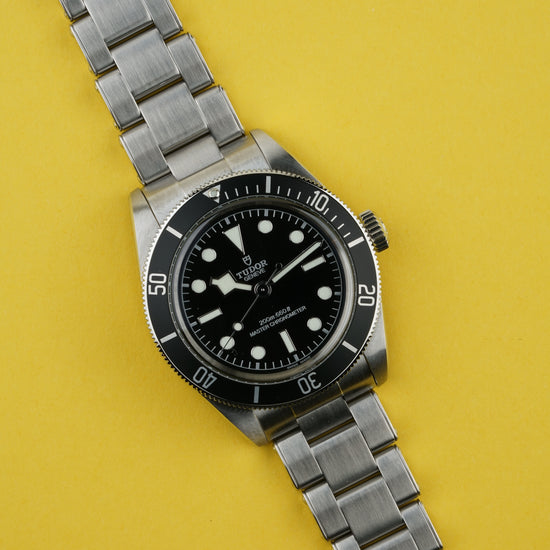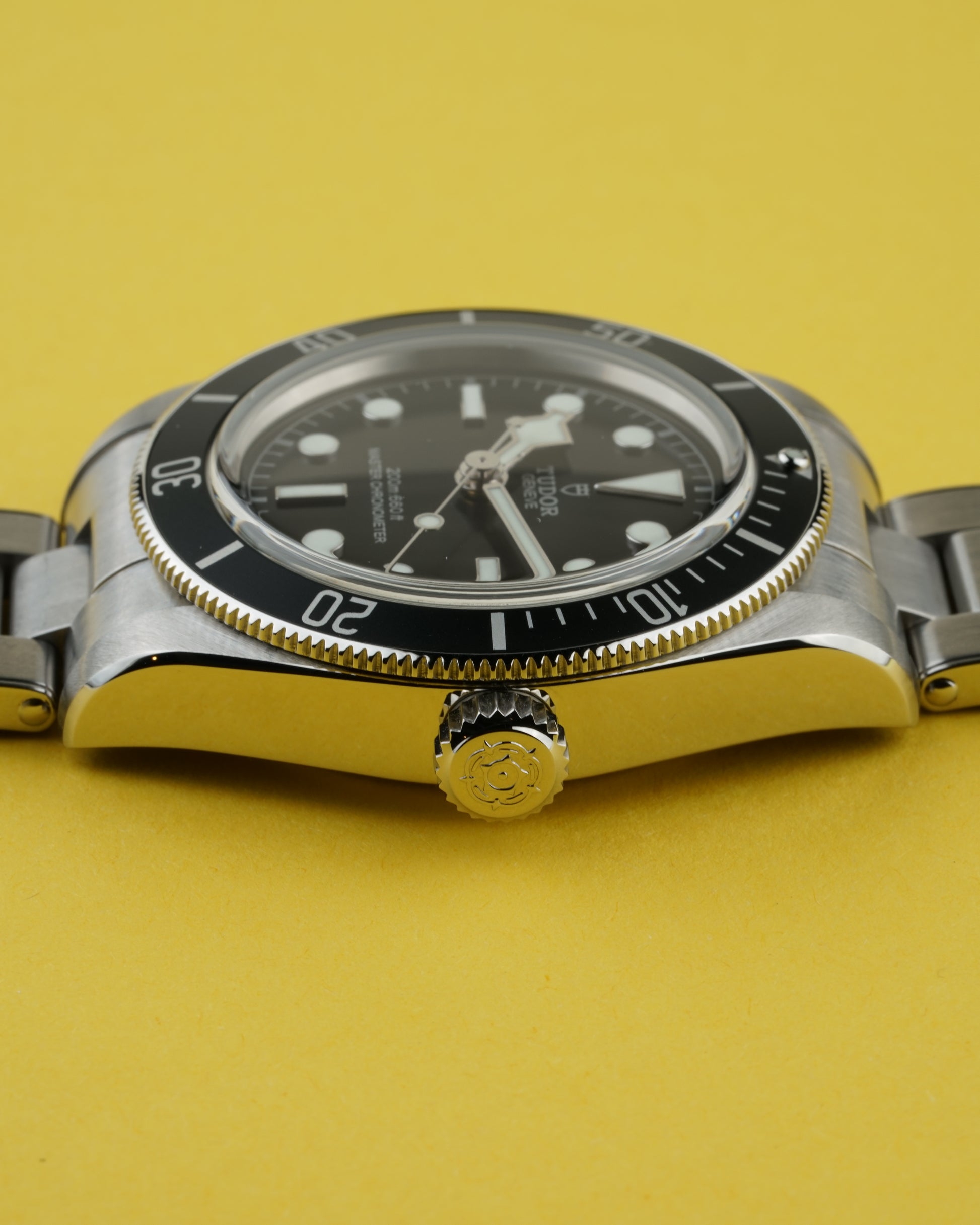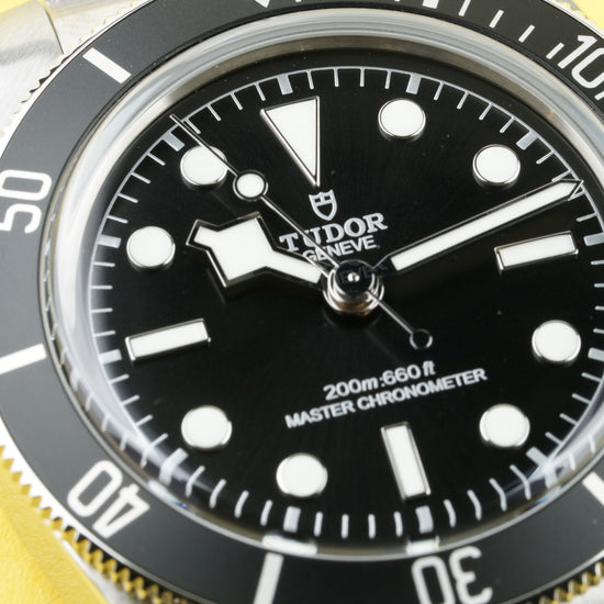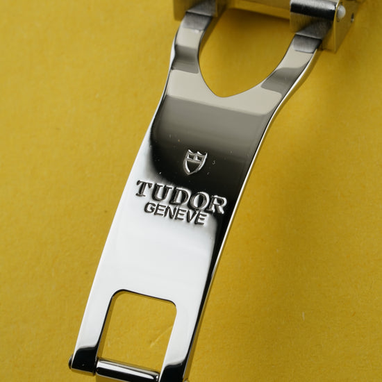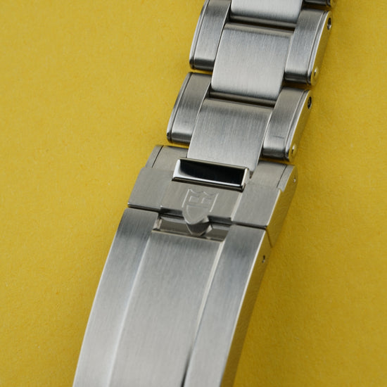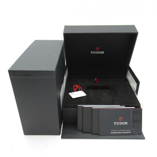 This model is distinguished by its 41 mm stainless steel case and unidirectional bezel with a black aluminum insert, framing a domed ink-black dial with silver-colored accents, presented on the refined 5-link stainless steel bracelet fitting a wrist up to approx. 21 cm. Tudor warranty card from 01-06-2025.