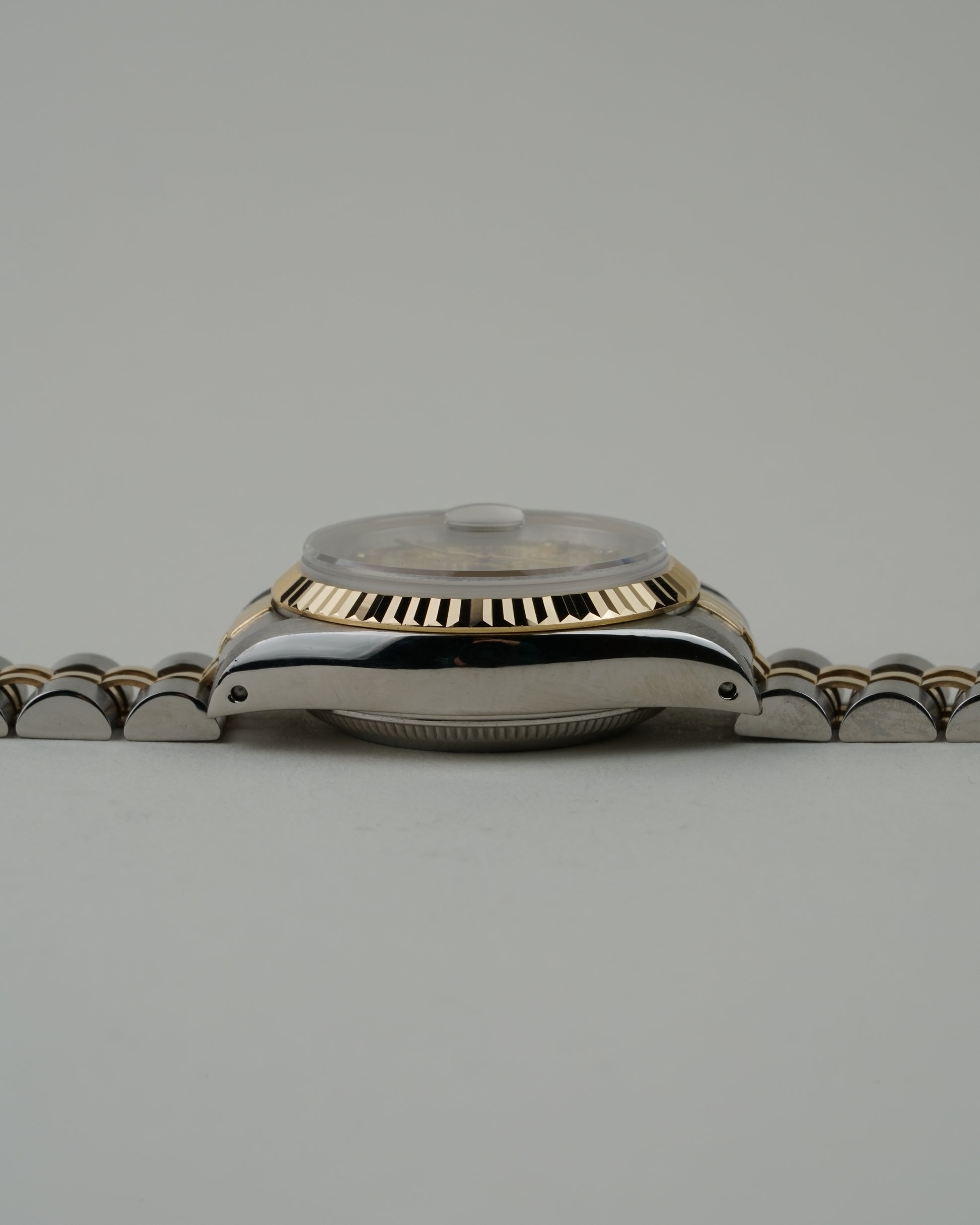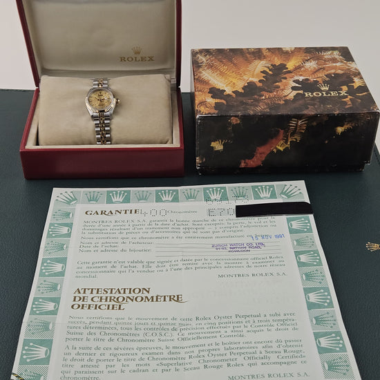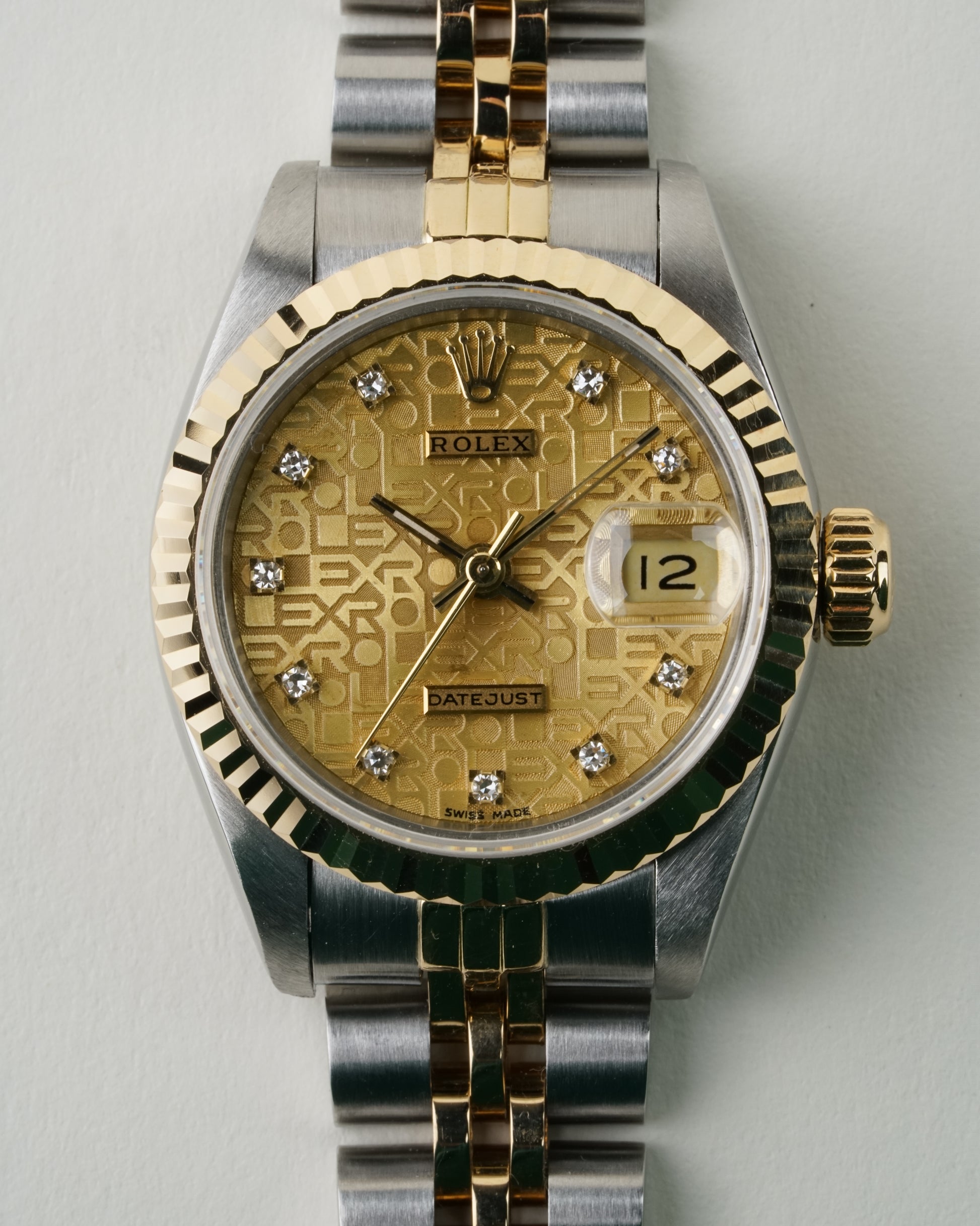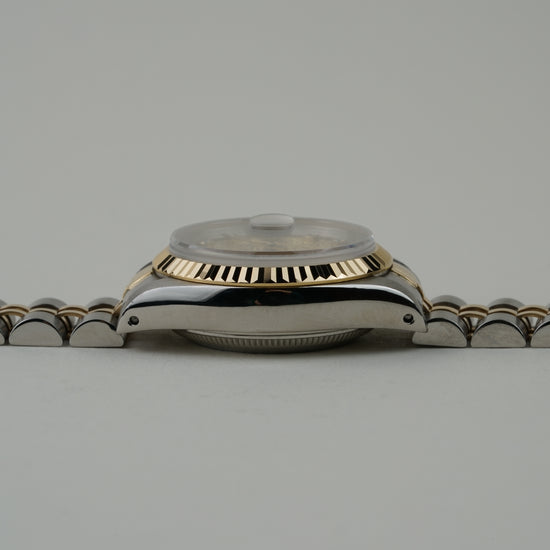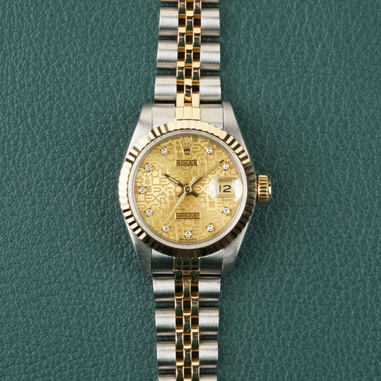 The Rolex Lady-Datejust Ref. 69173 is a standout example of neo-vintage sophistication, uniquely distinguished by its rare Champagne "Jubilee" Logo dial adorned with factory-set diamonds. Its elegant 26 mm stainless steel and 18k yellow gold case is crowned by the iconic fluted bezel, creating a radiant play of light that defines the classic Rolesor aesthetic.
